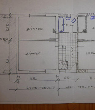 Das bestehende Wohnhaus ist stark sanierungsbedürftig / baufällig – ein Neubau wäre empfehlenswert. Die Raumaufteilung gestaltet sich wie folgt:
